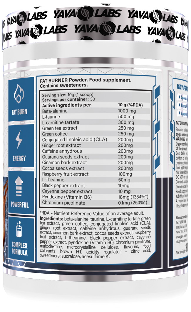 تحتوي تركيبة Yava Labs Fat Burner 300g على مكونات طبيعية فعالة مثل الكافيين ومستخلص الشاي الأخضر والكولين وحمض الليبويك والليستاتين وفيتامين بي6 وبي12، والتي تعمل بشكل متناغم لتحفيز الأيض وزيادة حرق الدهون، كما تعمل على تحسين الطاقة والتركيز والأداء العام.
