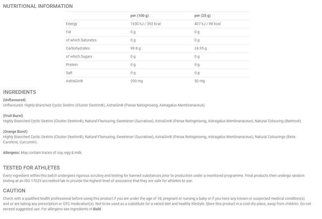 يناسب النباتيين وبحجم ٤٨ سكوب. نوع الكارب فيه يعتبر من الصيغ الجديدة وهو كلستر دكسترين (Cluster Dextrin) وله ميزة سرعة ذوبانه في الماء وامتصاصه للعضل بشكل سريع جدا و تم اضافة ٥٠ مغ استراجين لزيادة الامتصاص.