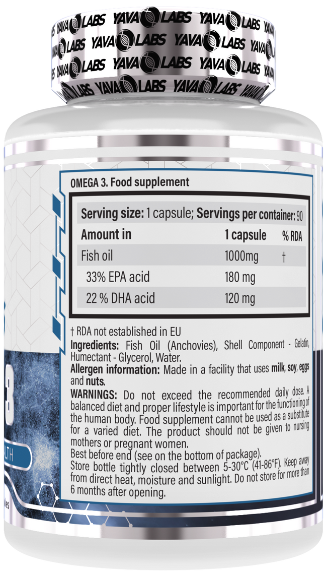 تم تصميم Yava Labs Omega 3 لتحسين صحة القلب والأوعية الدموية، وتعزيز صحة المخ والجهاز العصبي. يعد المنتج مثاليًا لأولئك الذين لا يستهلكون كمية كافية من الأسماك والأطعمة الغنية بالأحماض الدهنية الأساسية Omega-3 في نظامهم الغذائي. يمكن تناول Yava Labs Omega 3 مع الطعام.