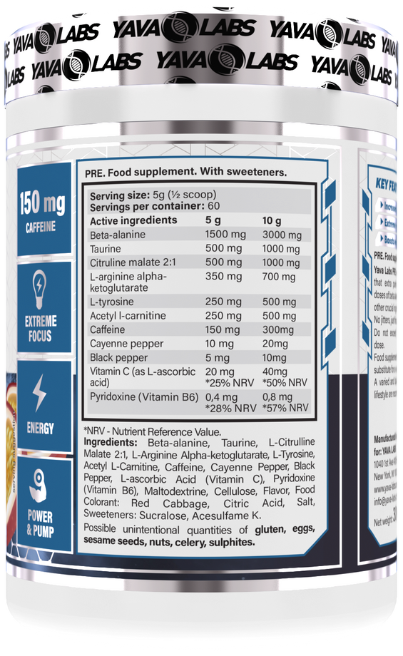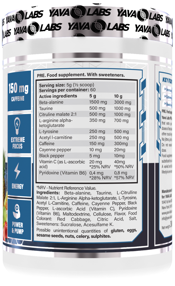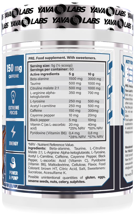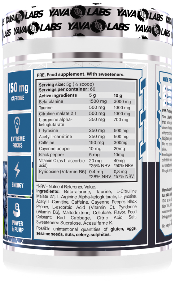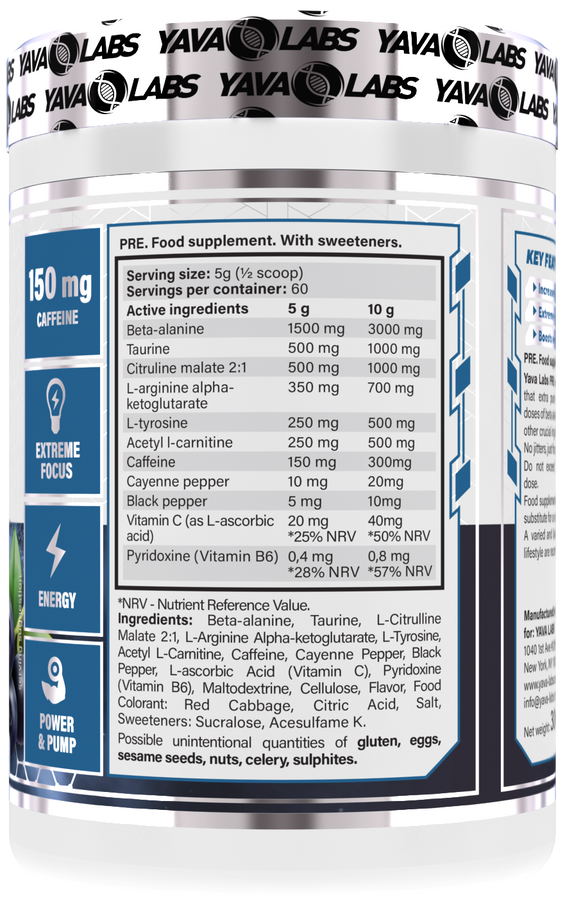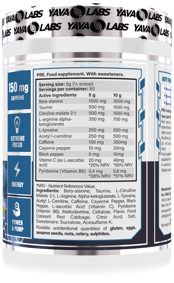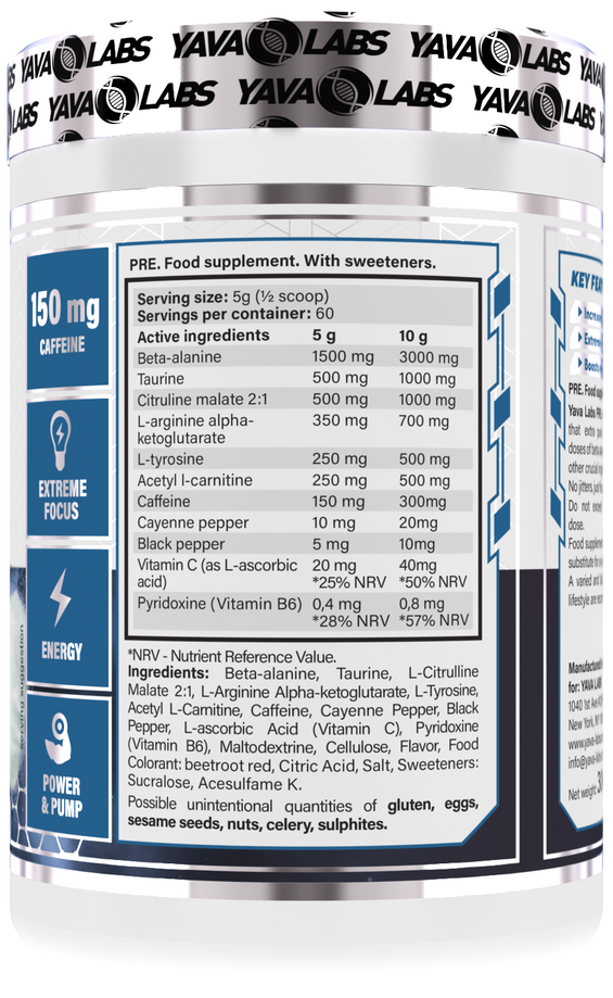 تحذير: يجب عدم تناول Yava Labs PRE في حالة الحساسية (فرط الحساسية) لأي من مكونات المنتج. يجب على الأمهات الحوامل والمرضعات دائمًا استشارة الطبيب قبل استخدام هذا المنتج أو أي منتج مكمل غذائي آخر. لا تتجاوز الجرعة اليومية الموصى بها.